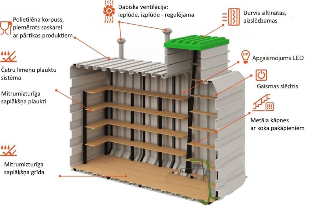 The body is made of polyethylene and is suitable for contact with food.The cellar has a built-in metal frame with shelving system, inlet and outlet ventilation..No electricity is required to maintain the temperature.. The cellar has battery-powered LED lighting and a thermometer with hydrometer for measuring humidity.