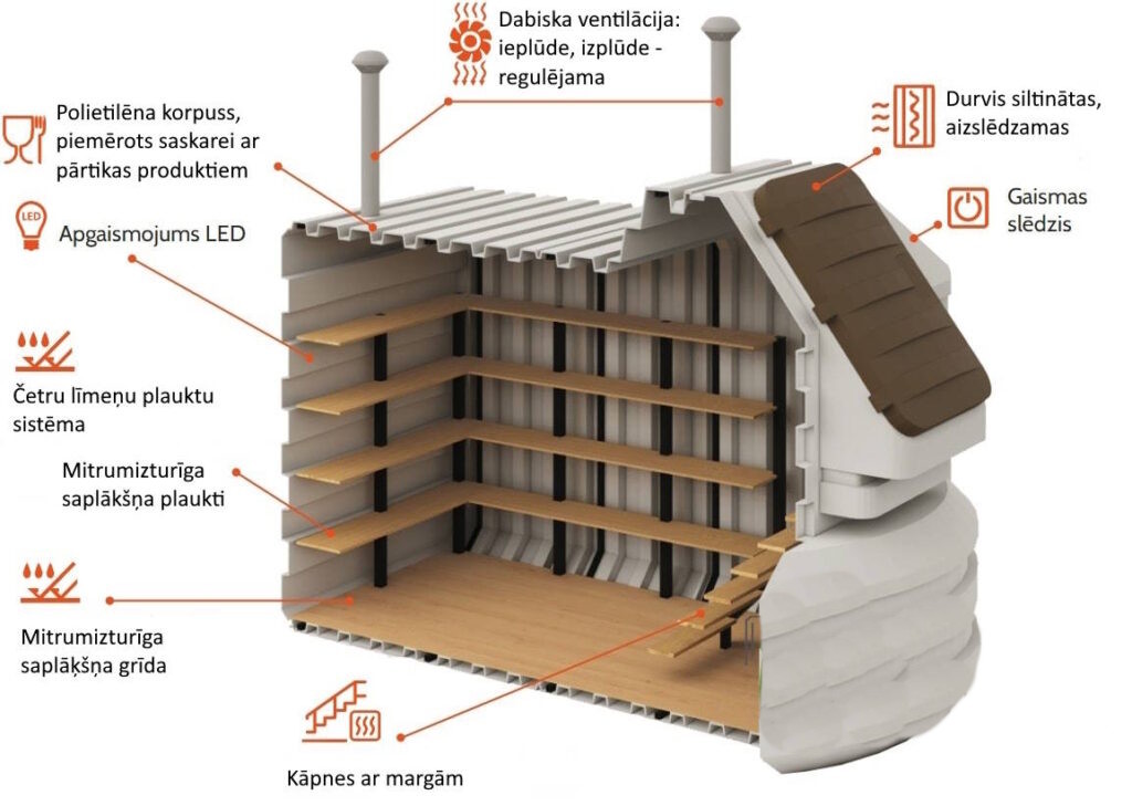 The body is made of polyethylene and is suitable for contact with food.The cellar has a built-in metal frame with shelving system, inlet and outlet ventilation..No electricity is required to maintain the temperature.. The cellar has battery-powered LED lighting and a thermometer with hydrometer for measuring humidity.