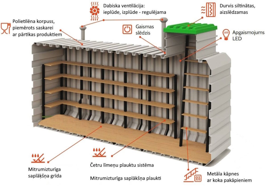 The body is made of polyethylene and is suitable for contact with food.The cellar has a built-in metal frame with shelving system, inlet and outlet ventilation..No electricity is required to maintain the temperature.. The cellar has battery-powered LED lighting and a thermometer with hydrometer for measuring humidity.