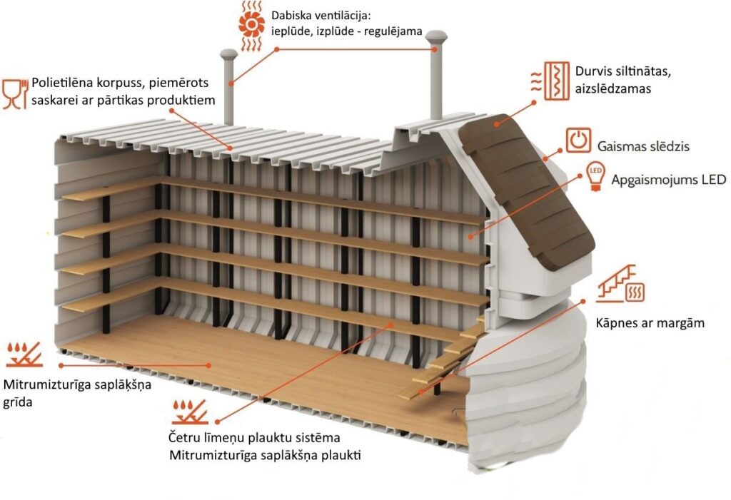 Korpuss izgatavots no polietilēna,tas ir piemērots saskarei ar pārtikas produktiem.Pagrabam ir iebūvēts metāla karkass ar plauktu sistēmu,ieplūdes un izplūdes ventilācija.Temperatūras saglabāšanai nav nepiecišama elektrība. Pagrabam ir LED apgaismojums ar bateriju un termometrs ar hidrometru mitruma mērīšanai.